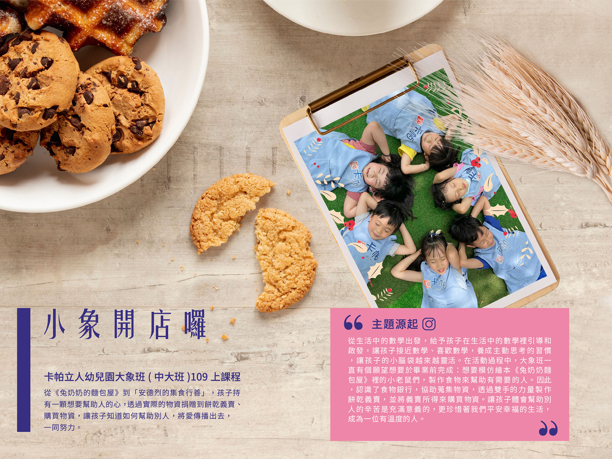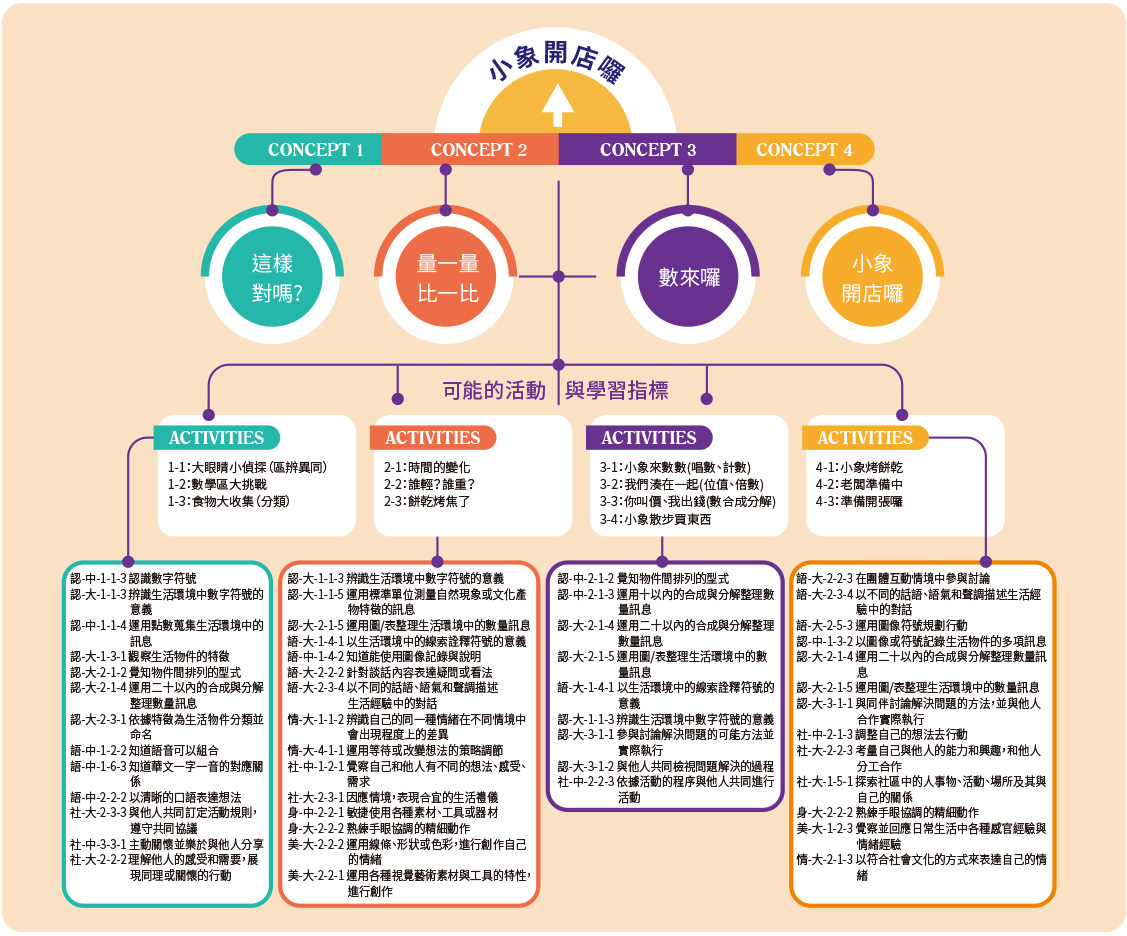109上大象班課程,老師透過孩子在生活中發現數學,實際的學習數的應用,從具體到抽象,同時也讓孩子從餅乾食譜挑選→規劃清單→採購→動手做餅乾→義賣→全數購買安德烈物資幫助需要的人,過程中孩子需要學會分工合作、問題解決等能力養成。透過體驗式教育,讓孩子們感受付出愛心的感動!而收穫最多的是老師的數學能力也提升了,以及一起和孩子們共同探索解題,一起經歷燒腦到破關的成就感!